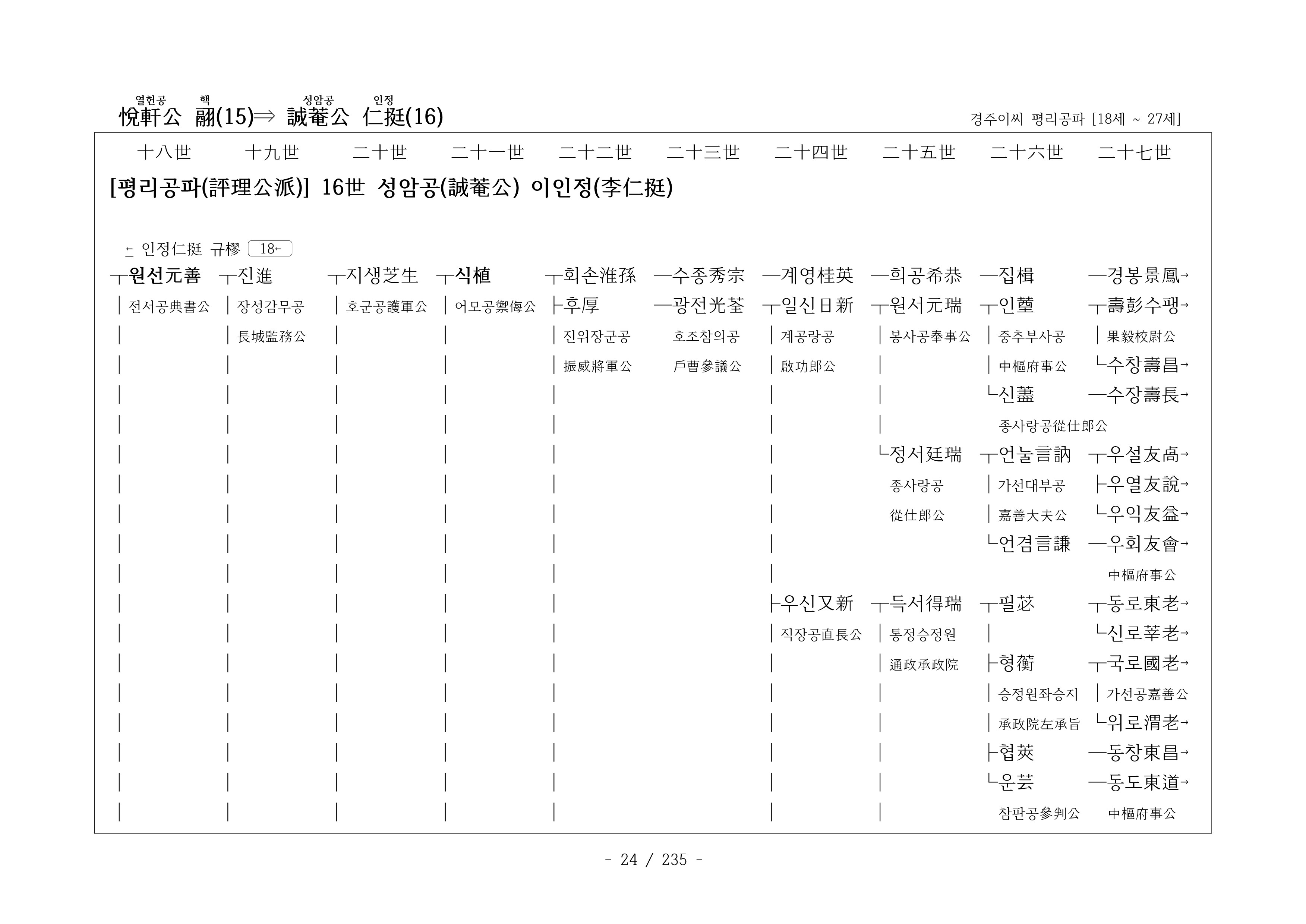 (慶州李氏 分派 및 系統圖 中始祖 ~ 27世)
