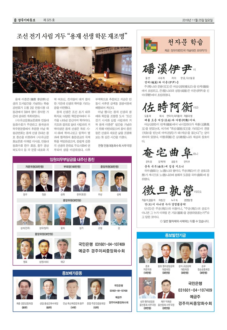 *경주이씨 종보 제325호 8면 (2018년 11월 25일) 조선 전기 사림 거두 "용재 선생 학문 재조명"