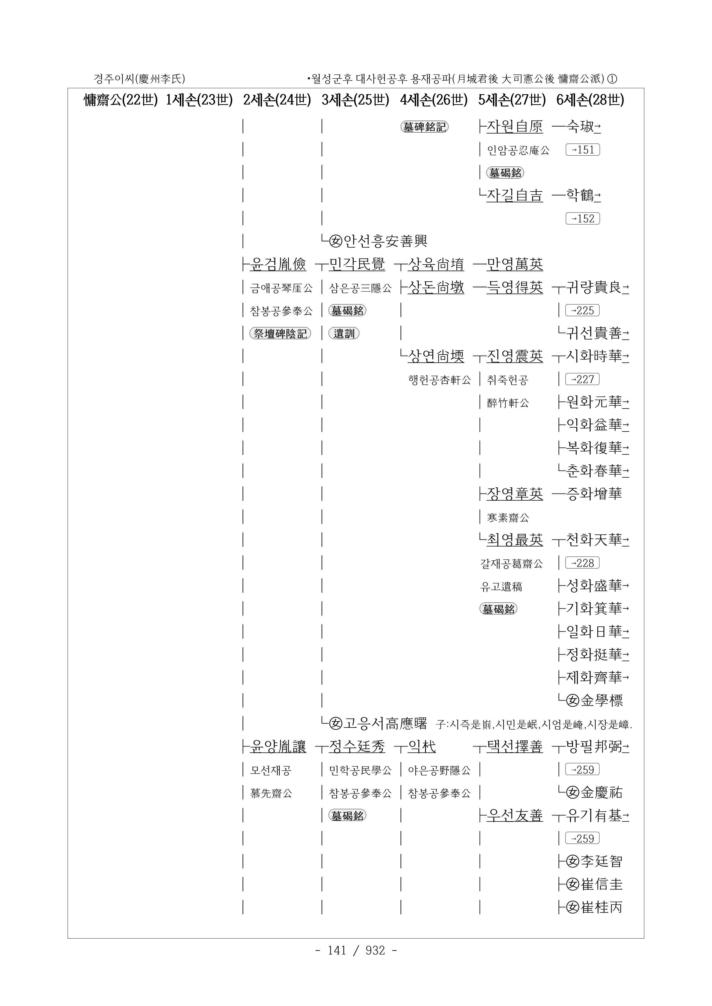 *월성군파(月城君派)의 계대(系代)는 천오(舛誤)로 5대를 상향했습니다.