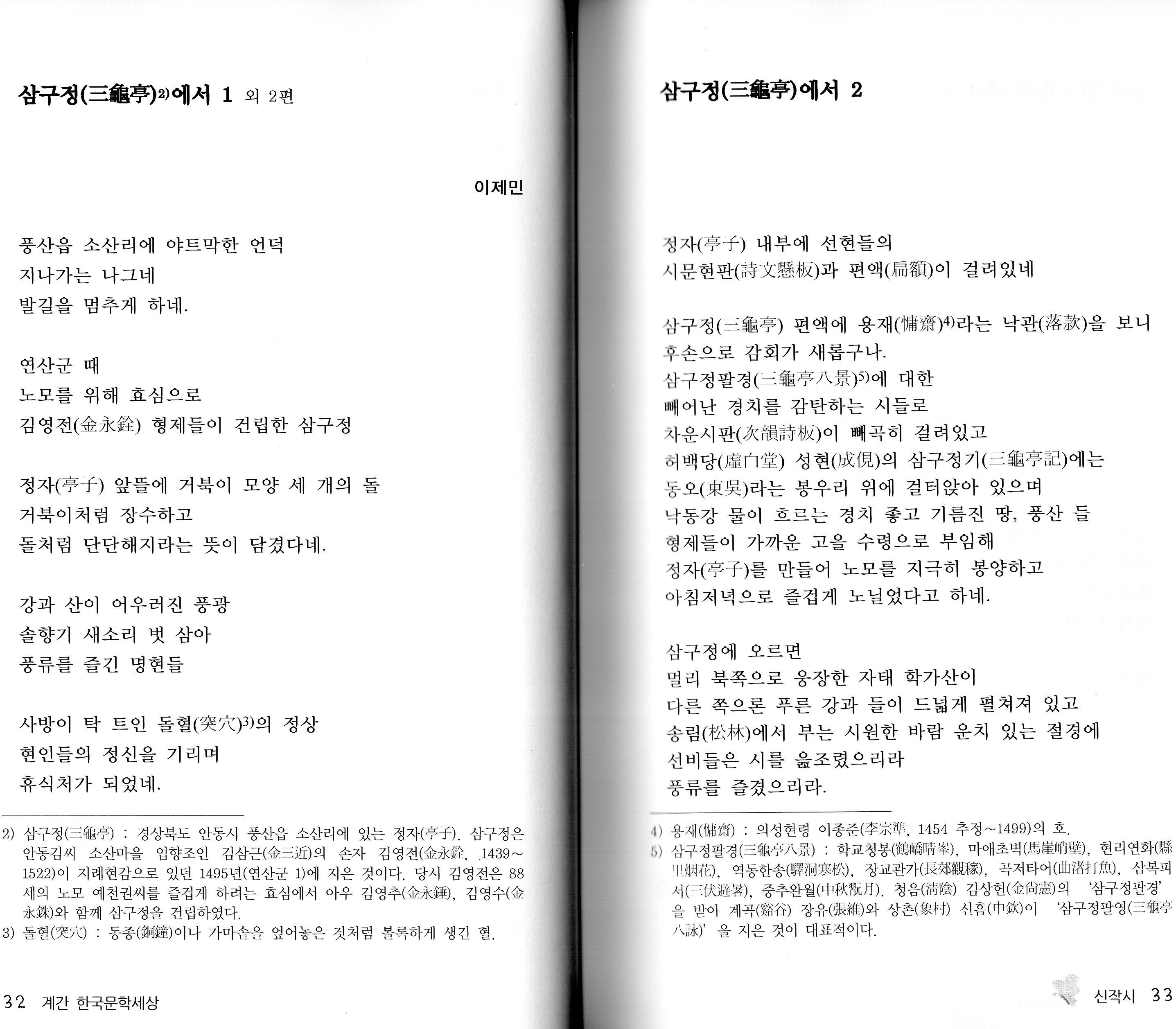4) 삼구정팔경(三龜亭八景) : 학교청봉(鶴嶠晴峯), 마애초벽(馬崖峭壁), 현리연화(縣里烟花), 역동한송(驛洞寒松), 장교관가(長郊觀稼), 곡저타어(曲渚打魚), 삼복피서(三伏避暑), 중추완월(中秋翫月). 청음(淸陰) 김상헌(金尙憲)의 ‘삼구정팔경’을 받아 계곡(谿谷) 장유(張維)와 상촌(象村) 신흠(申欽)이 ‘삼구정팔영(三龜亭八詠)’을 지은 것이 대표적이다.
