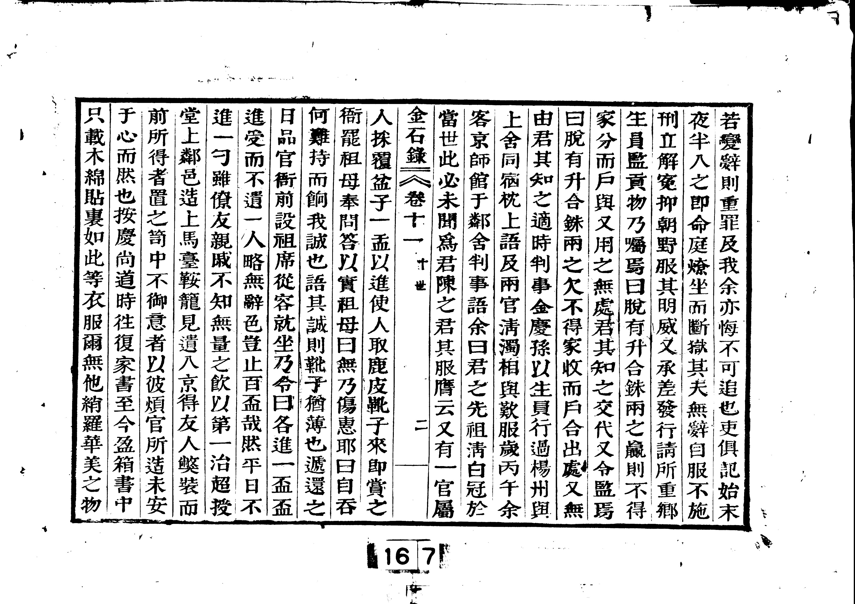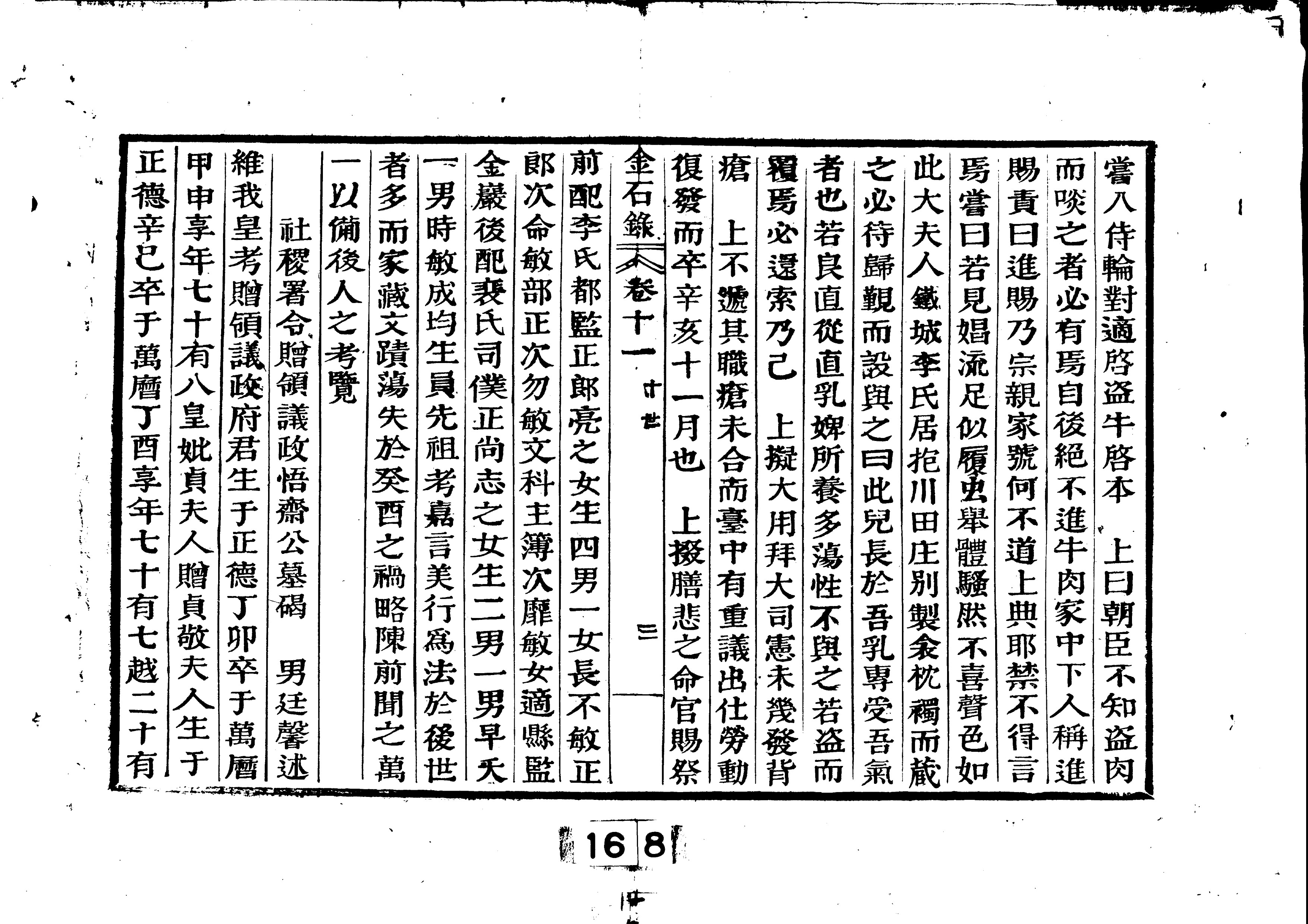 遞還之日品官衙前設祖席從容就坐乃今日各進一杯杯進受而不遺一人畧無辭色豈止百杯哉然平日不進一勺雖僚友親戚不知無量之飮以第一治超授堂上隣邑造上馬臺鞍籠見遺入京得友人弊裝而前所得者置之笥中不御意者以彼煩官所造未安于心而然也按慶尙道時往復家書至今盈箱書中只載木綿貼裏如此等衣服爾無他綃羅華美之物嘗入侍輪對適啓盜牛啓本 上曰朝臣不知盜肉而啖之者必有焉自後絶不進牛肉家中下人稱進賜責曰進賜乃宗親家號何不道上典耶禁不得言焉嘗曰若見娼流足似履虫擧體騷然不喜聲色如此大夫人鐵城李氏居抱川田庄別製衾枕襡而藏之必待歸覲而設與之曰此兒長於吾乳專受吾氣者也若良直從直乳婢所養多蕩性不與之若盜而覆焉必還索乃己○上擬大用拜大司憲未幾發背瘡上不遞其職瘡未合而臺中有重議出仕勞動復發而卒辛亥十一月也 上輟膳悲之命官賜察前配李氏都監正郞亮之女生四男一女長不敏正郎次命敏副正次勿敏文科主簿次靡敏女適縣監金巖後配裵氏司僕正尙志之女生二男一男早夭一男時敏成均生員○先祖考嘉言美行爲法於後世者多而家藏文蹟蕩失於癸酉之禍畧陣前聞之萬一以備後人之考覽