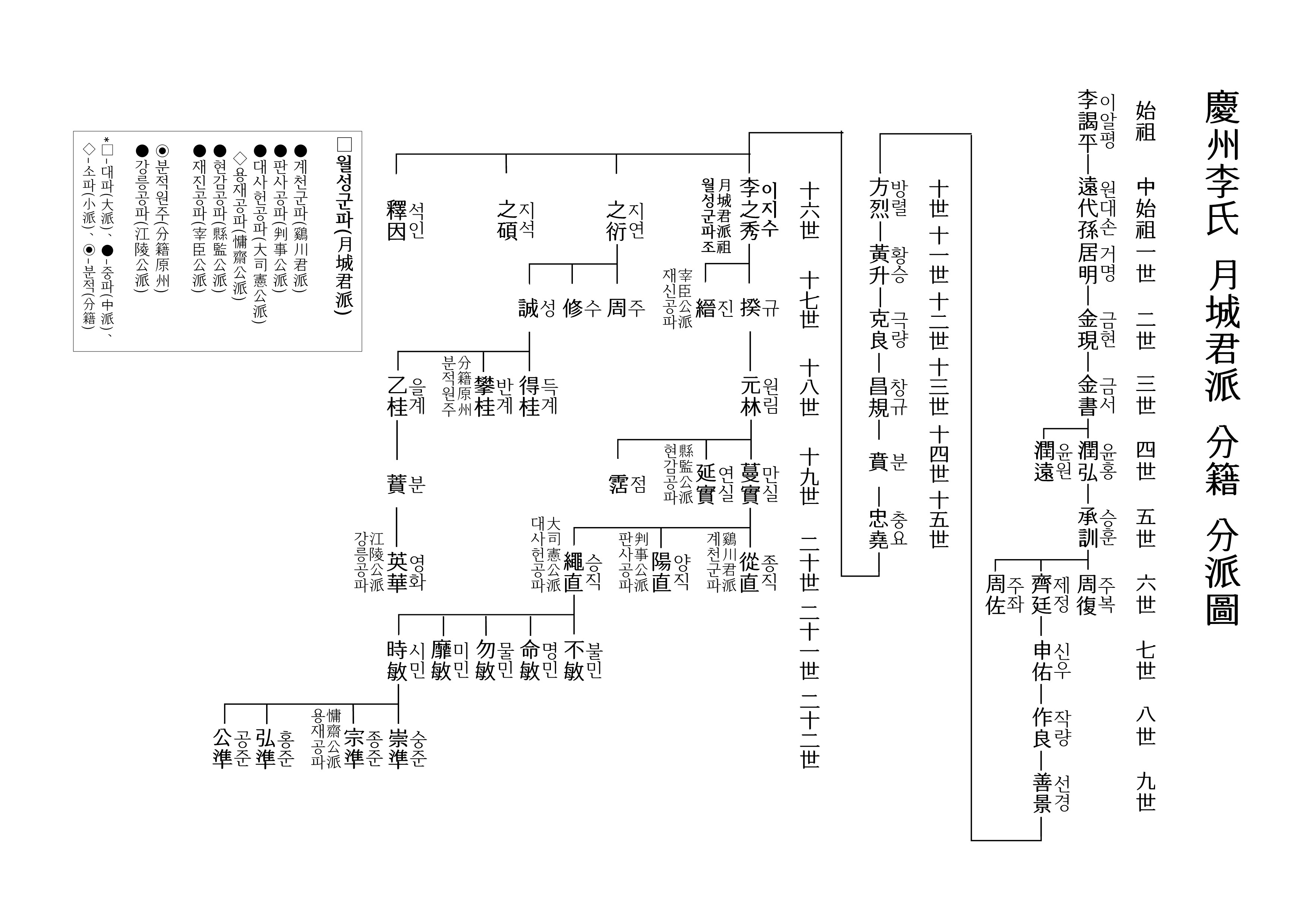 *월성군파(月城君派)의 계대(系代)는 천오(舛誤)로 5대를 상향했습니다.