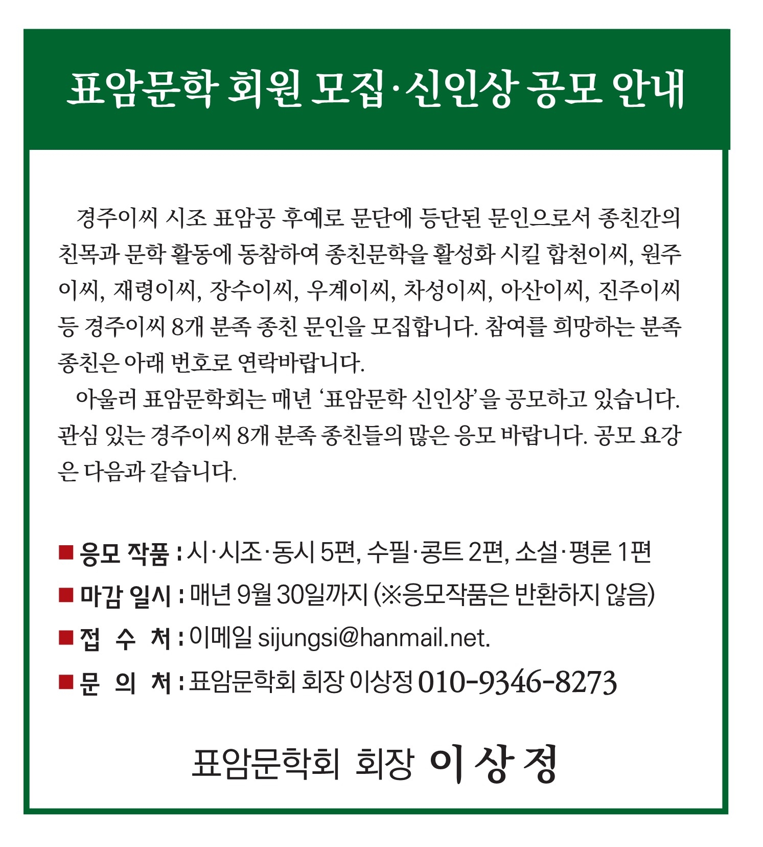 [경주이씨] 표암문학 회원 모집·신인상 공모 안내
