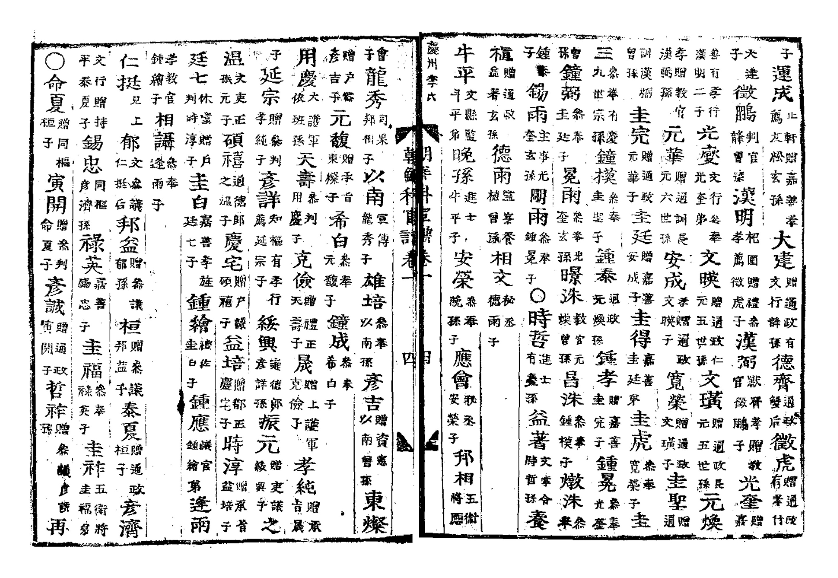 煕幹[주:進士應慶玄孫]聖東[주:嘉善煕幹玄孫]榮啓[주:贈參議聖東孫]圭漢[주:贈左尹榮啓子]鍾仁[주:五衛將圭漢子]鍾基[주:壽崇政黿后]克雨[주:副護軍鍾基子]○大建 [주:諮議鼉曾孫]時發[주:見文大建 子]慶徽
