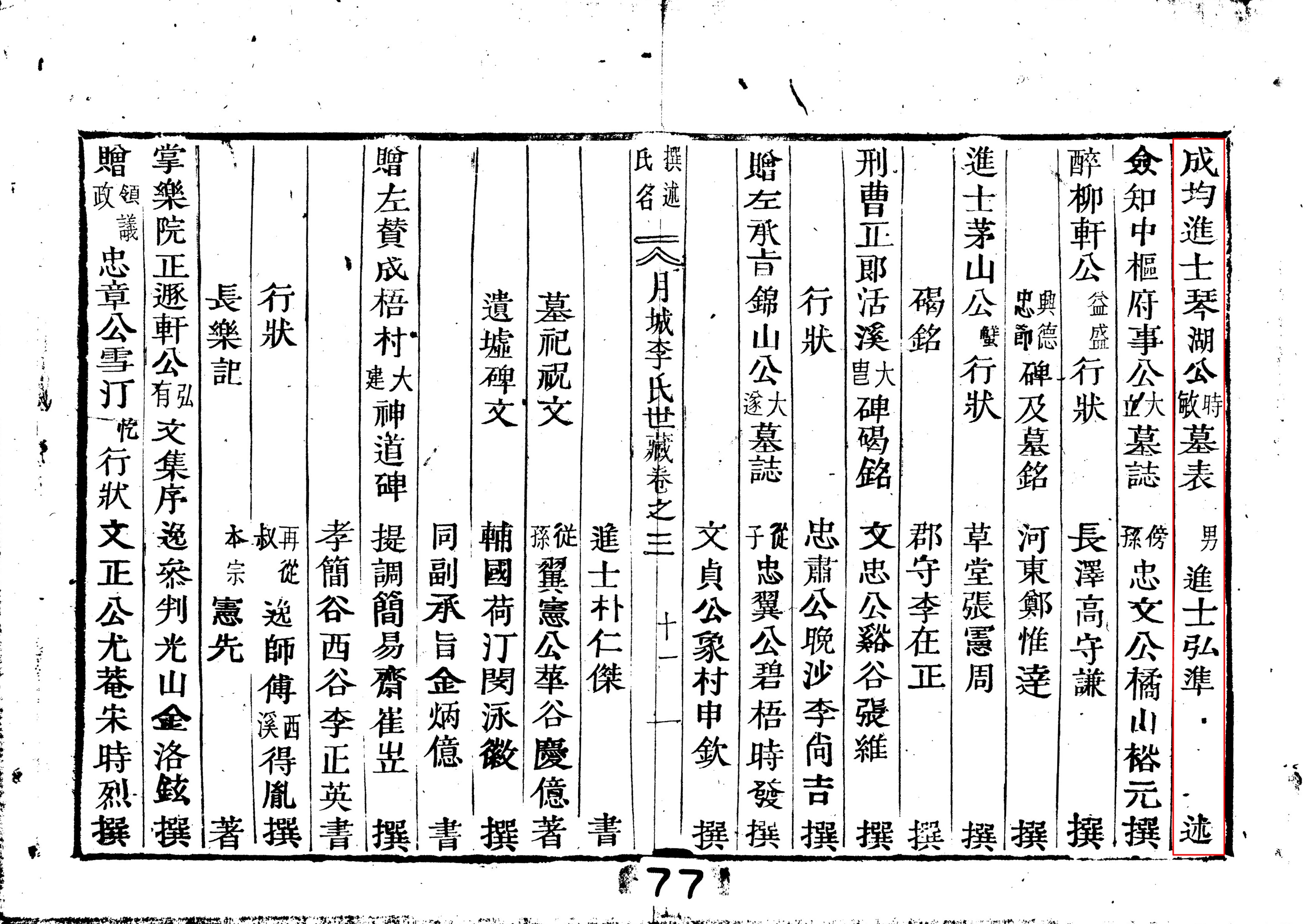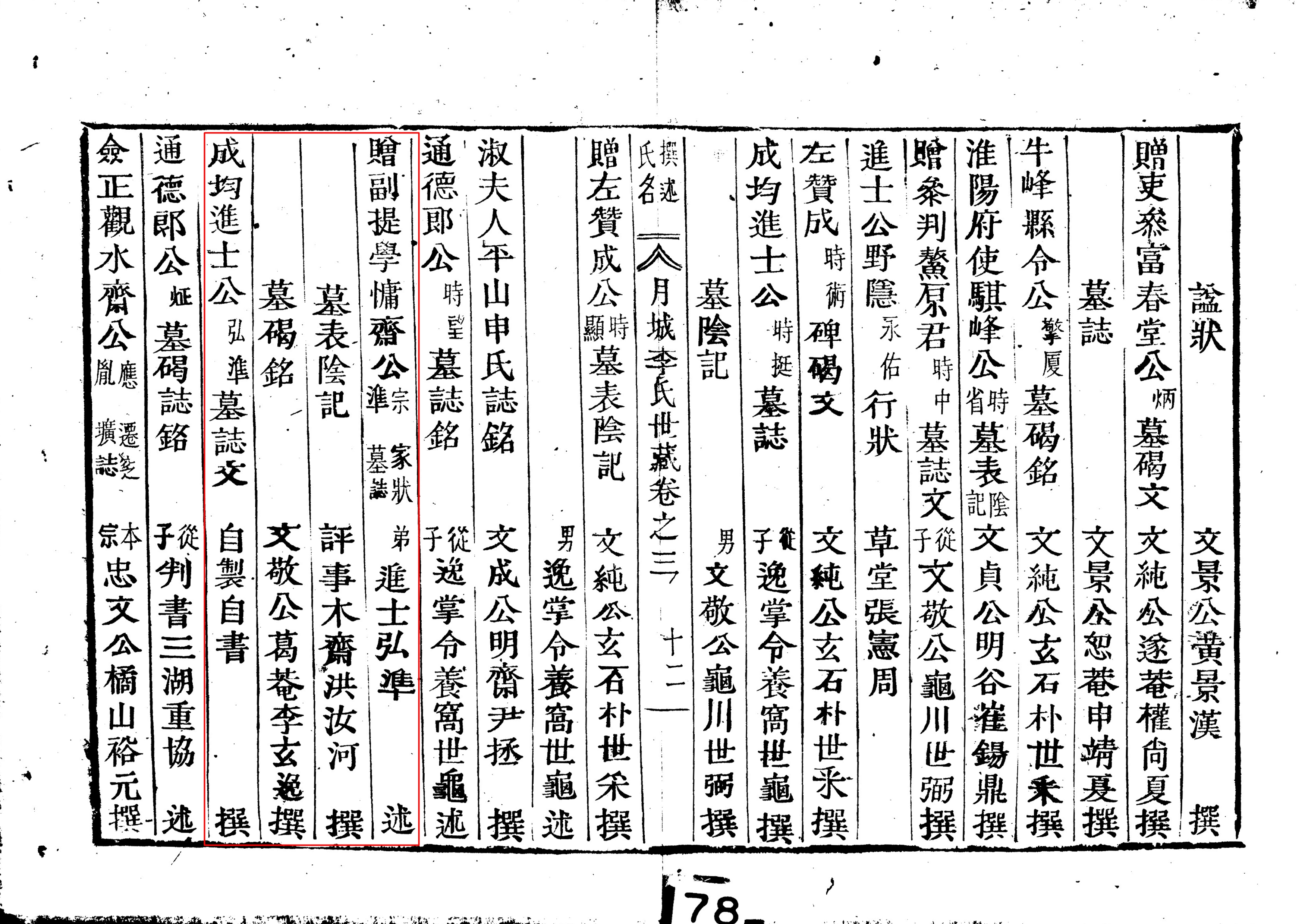 ·증부제학용재공(贈副提學慵齋公) 종준(宗準) 가장(家狀) 묘지(墓誌) 제(弟) 진사홍준(進士弘準) 술(述) [용재공(慵齋公) 이종준(李宗準). 父: 금호공(琴湖公) 이시민(李時敏). 祖父: 대사헌공(大司憲公) 이승직(李繩直)] [눌재공(訥齋公) 이홍준(李弘準). 용재공(慵齋公) 이종준(李宗準) 제(弟)]