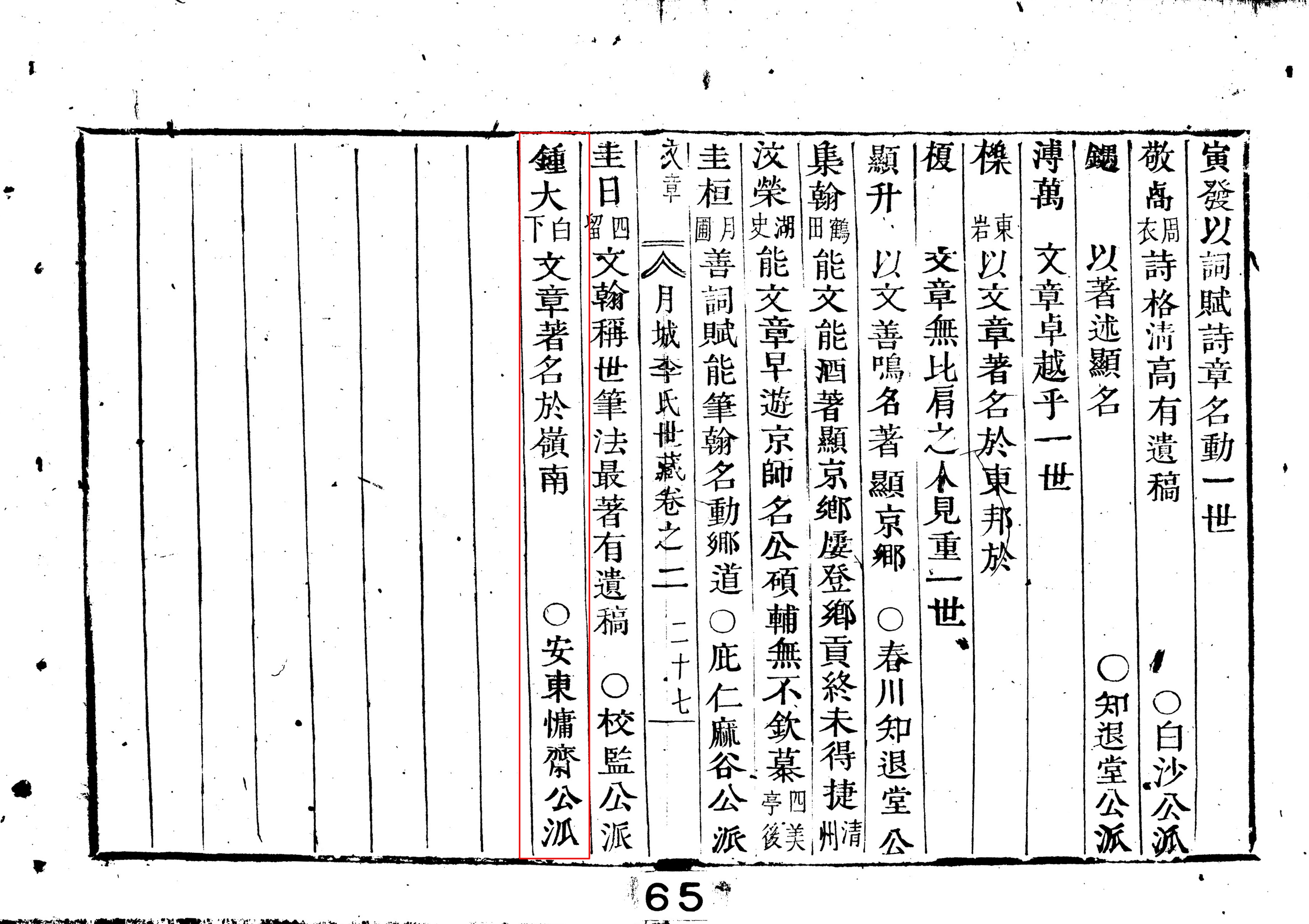 ·종대(鍾大) 백하(白下) 문장저명어영남(文章著名於嶺南) ○안동용재공파(安東慵齋公派)