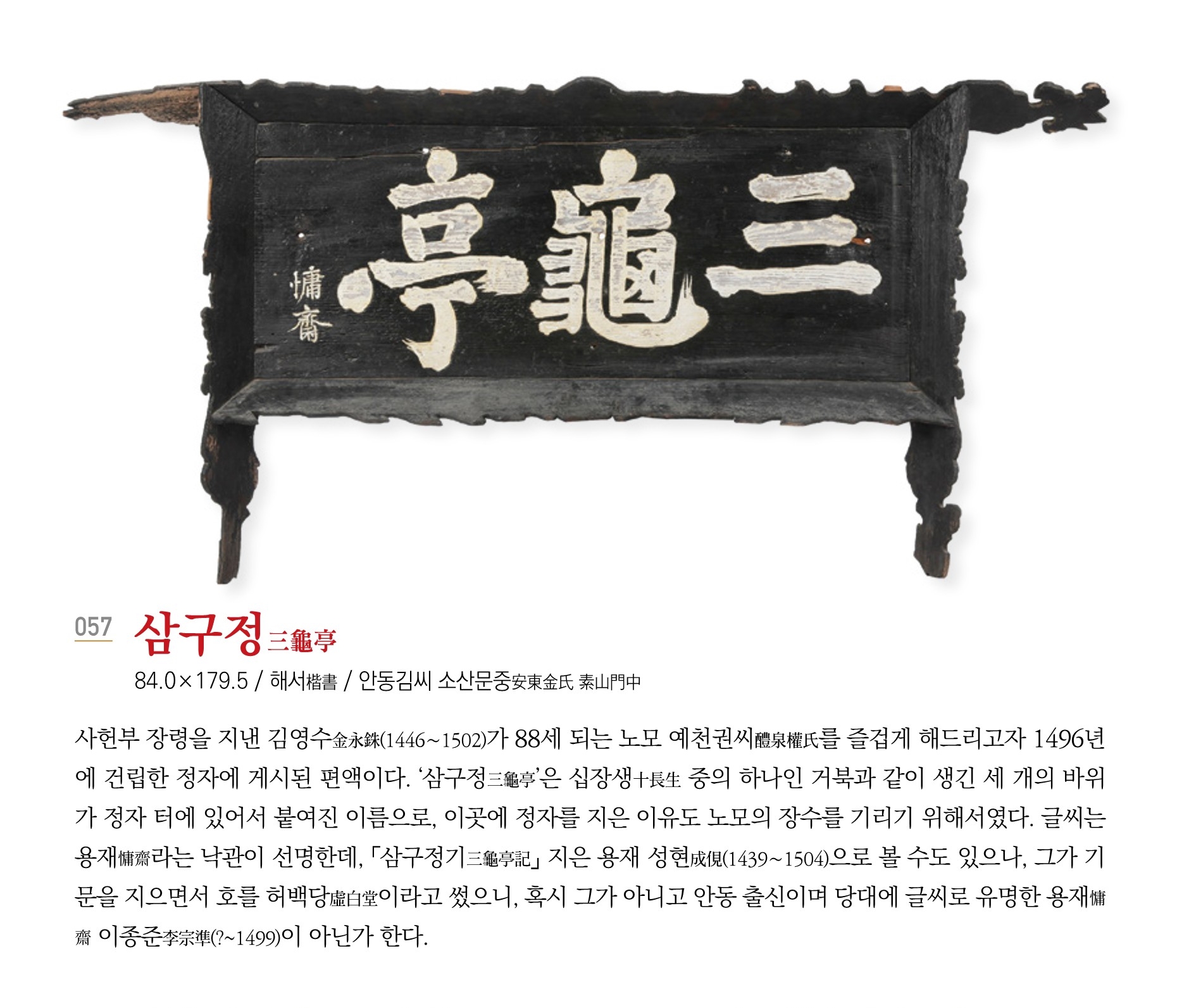 *한국국학진흥원 『한국의 편액(2020)』 200쪽 057 삼구정三龜亭