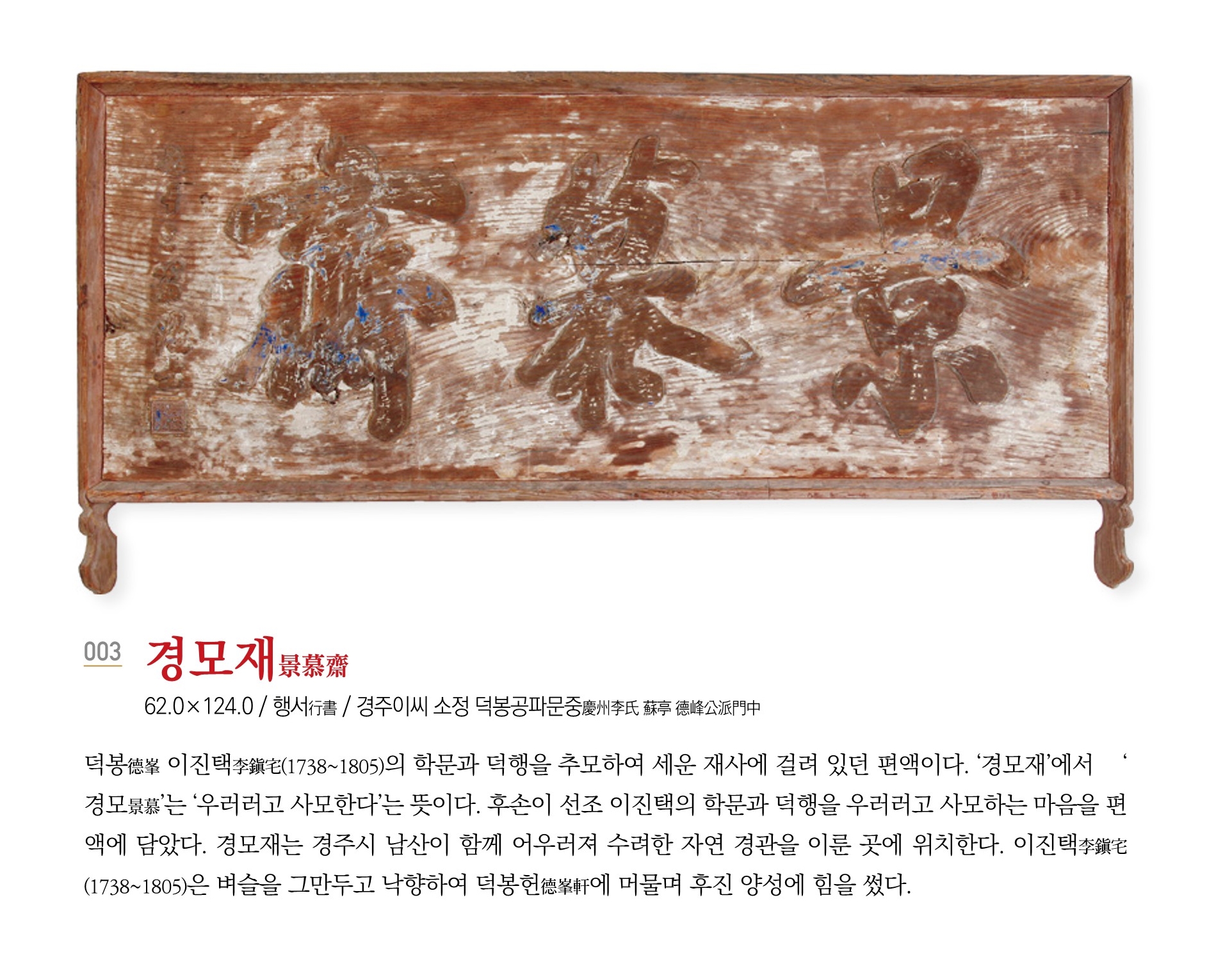 덕봉德峯 이진택李鎭宅(1738~1805)의 학문과 덕행을 추모하여 세운 재사에 걸려 있던 편액이다. ‘경모재’에서 ‘경모景慕’는 ‘우러러고 사모한다’는 뜻이다. 후손이 선조 이진택의 학문과 덕행을 우러러고 사모하는 마음을 편액에 담았다. 경모재는 경주시 남산이 함께 어우러져 수려한 자연 경관을 이룬 곳에 위치한다. 이진택李鎭宅(1738~1805)은 벼슬을 그만두고 낙향하여 덕봉헌德峯軒에 머물며 후진 양성에 힘을 썼다.
