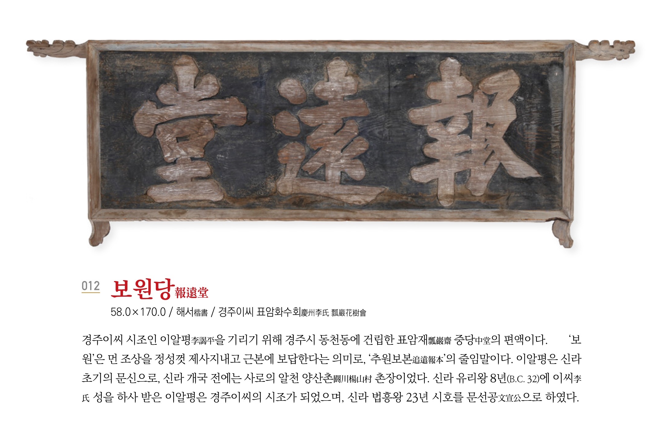 경주이씨 시조인 이알평李謁平을 기리기 위해 경주시 동천동에 건립한 표암재瓢巖齋 중당中堂의 편액이다. ‘보원’은 먼 조상을 정성껏 제사지내고 근본에 보답한다는 의미로, ‘추원보본追遠報本’의 줄임말이다. 이알평은 신라 초기의 문신으로, 신라 개국 전에는 사로의 알천 양산촌閼川楊山村 촌장이었다. 신라 유리왕 8년(B.C. 32)에 이씨李氏 성을 하사 받은 이알평은 경주이씨의 시조가 되었으며, 신라 법흥왕 23년 시호를 문선공文宣公으로 하였다.