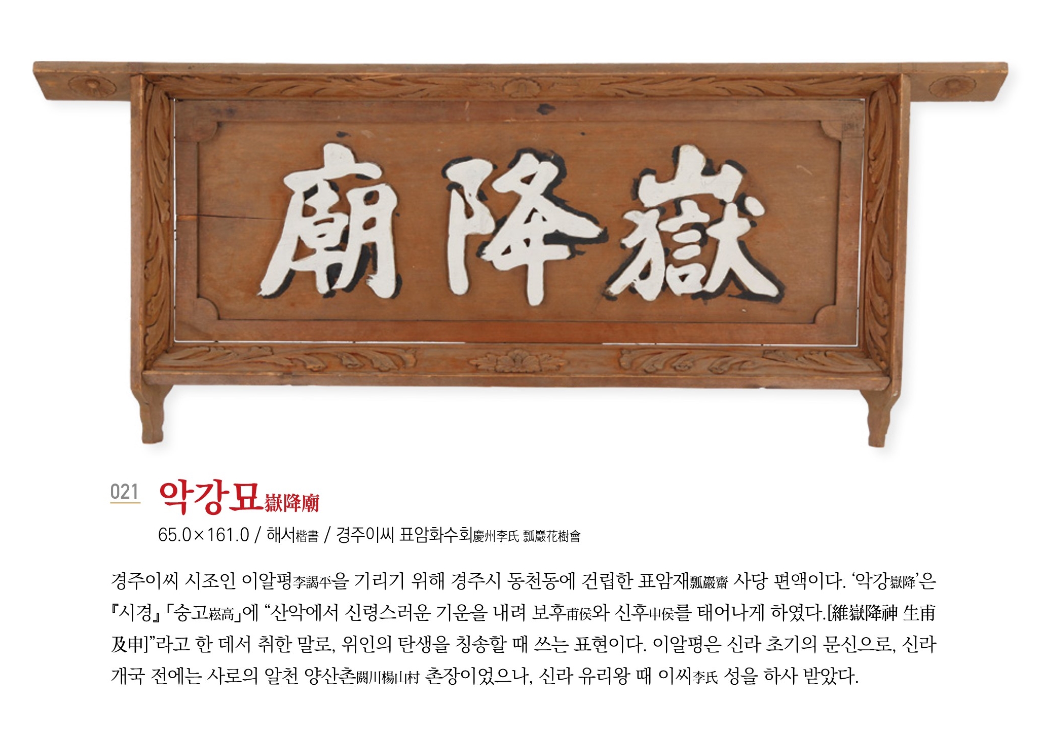 경주이씨 시조인 이알평李謁平을 기리기 위해 경주시 동천동에 건립한 표암재瓢巖齋 사당 편액이다. ‘악강嶽降’은 『시경』 「숭고崧高」에 “산악에서 신령스러운 기운을 내려 보후甫侯와 신후申侯를 태어나게 하였다.[維嶽降神 生甫及申]”라고 한 데서 취한 말로, 위인의 탄생을 칭송할 때 쓰는 표현이다. 이알평은 신라 초기의 문신으로, 신라 개국 전에는 사로의 알천 양산촌閼川楊山村 촌장이었으나, 신라 유리왕 때 이씨李氏 성을 하사 받았다.