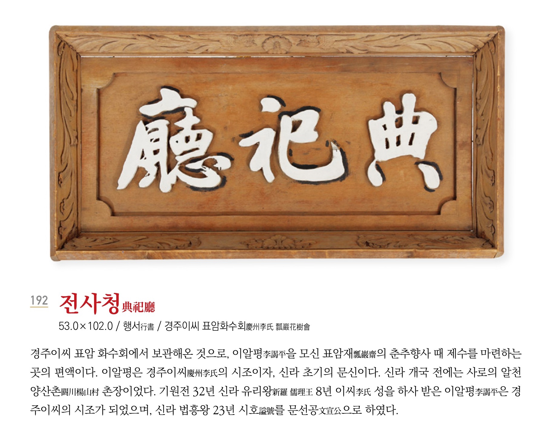 경주이씨 표암 화수회에서 보관해온 것으로, 이알평李謁平을 모신 표암재瓢巖齋의 춘추향사 때 제수를 마련하는 곳의 편액이다. 이알평은 경주이씨慶州李氏의 시조이자, 신라 초기의 문신이다. 신라 개국 전에는 사로의 알천양산촌閼川楊山村 촌장이었다. 기원전 32년 신라 유리왕新羅 儒理王 8년 이씨李氏 성을 하사 받은 이알평李謁平은 경주이씨의 시조가 되었으며, 신라 법흥왕 23년 시호謚號를 문선공文宣公으로 하였다.