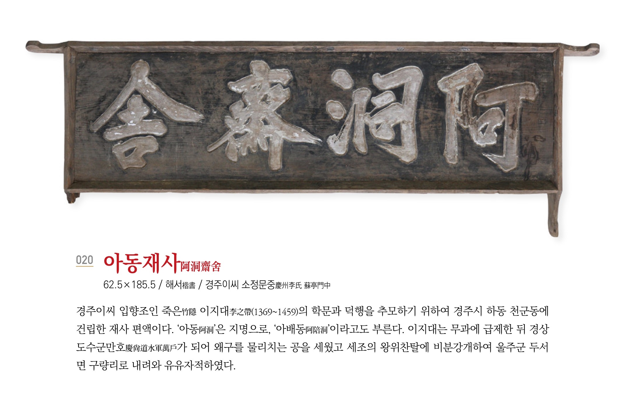 경주이씨 입향조인 죽은竹隱 이지대李之帶(1369~1459)의 학문과 덕행을 추모하기 위하여 경주시 하동 천군동에 건립한 재사 편액이다. ‘아동阿洞’은 지명으로, ‘아배동阿陪洞’이라고도 부른다. 이지대는 무과에 급제한 뒤 경상도수군만호慶尙道水軍萬戶가 되어 왜구를 물리치는 공을 세웠고 세조의 왕위찬탈에 비분강개하여 울주군 두서