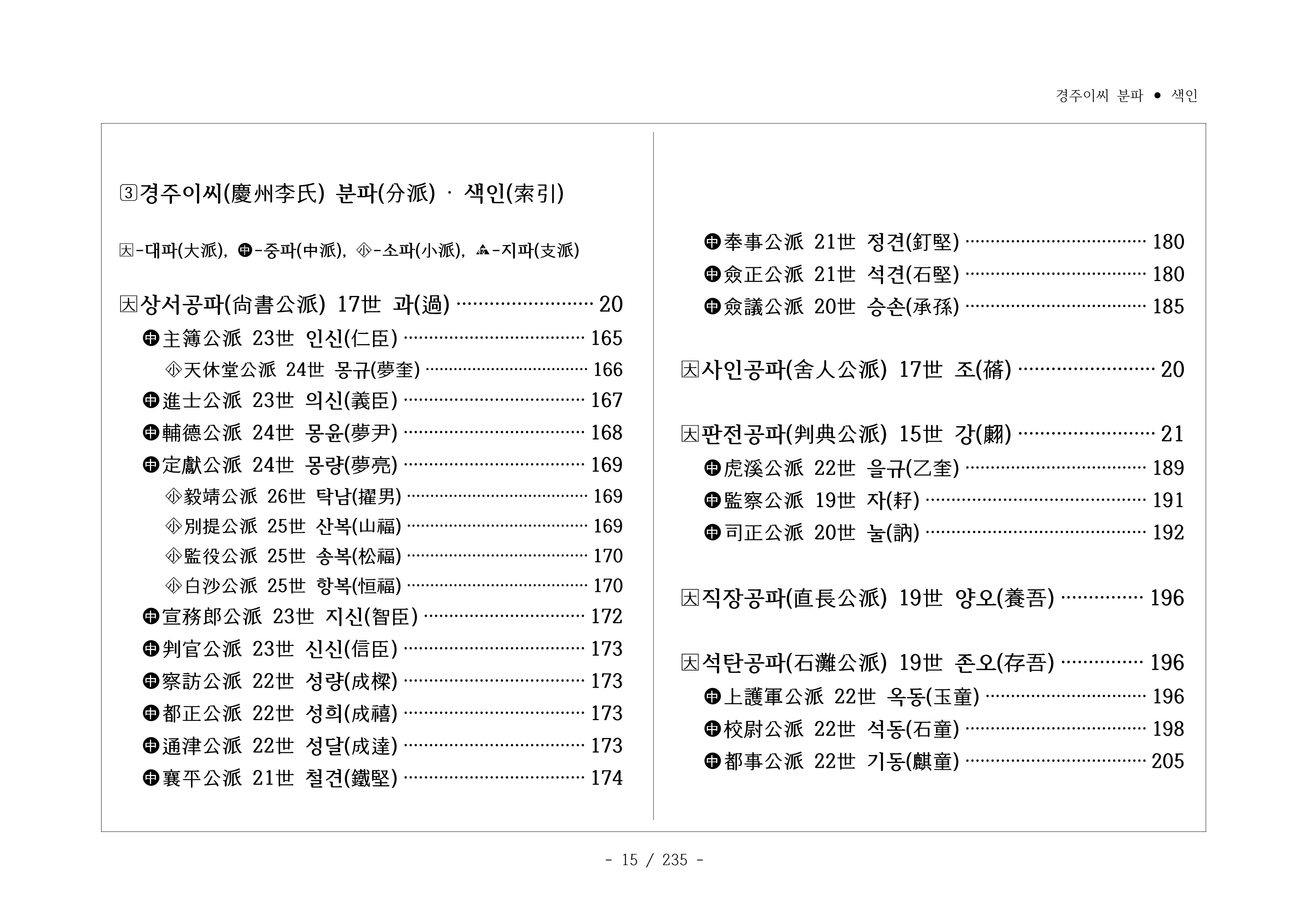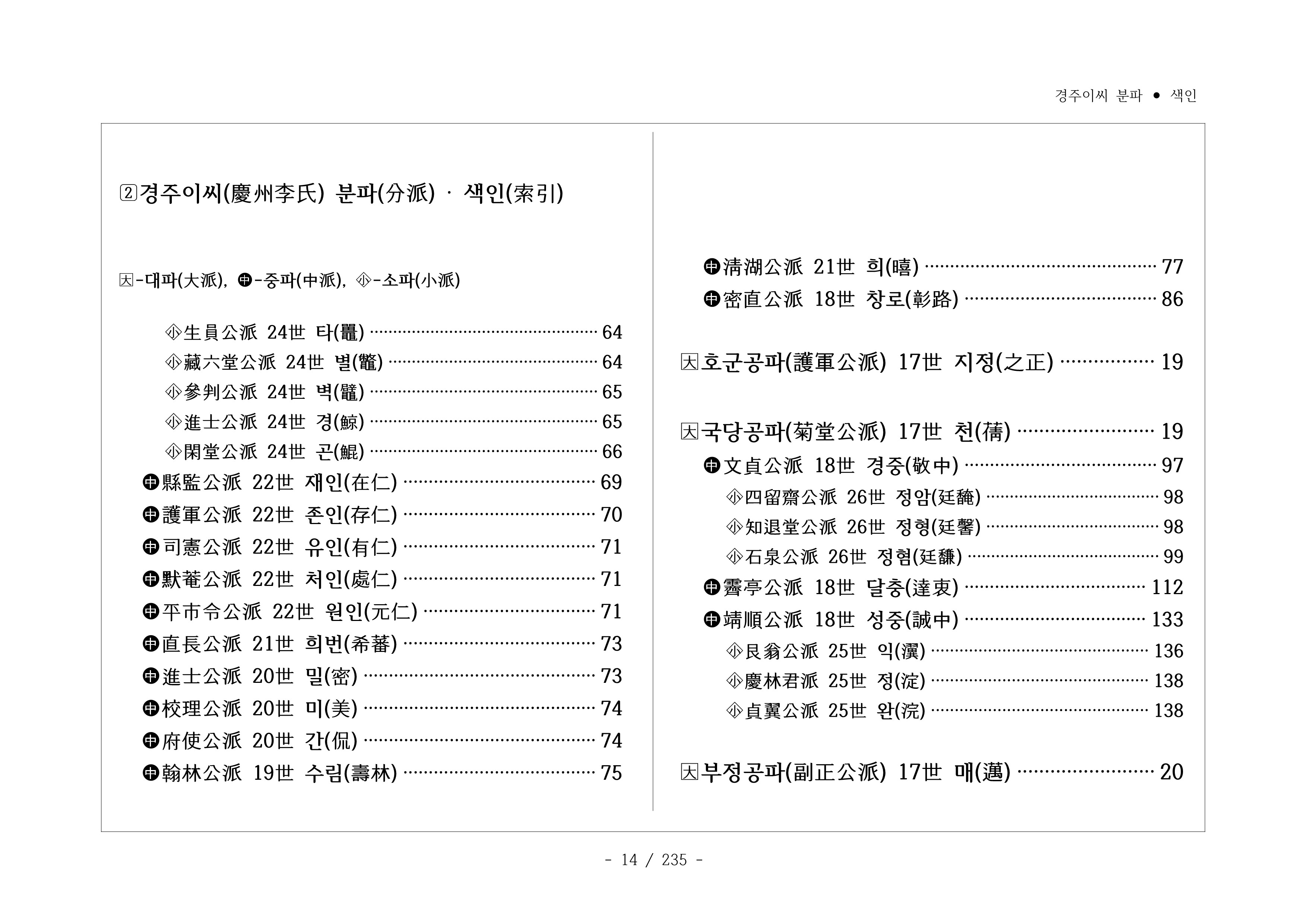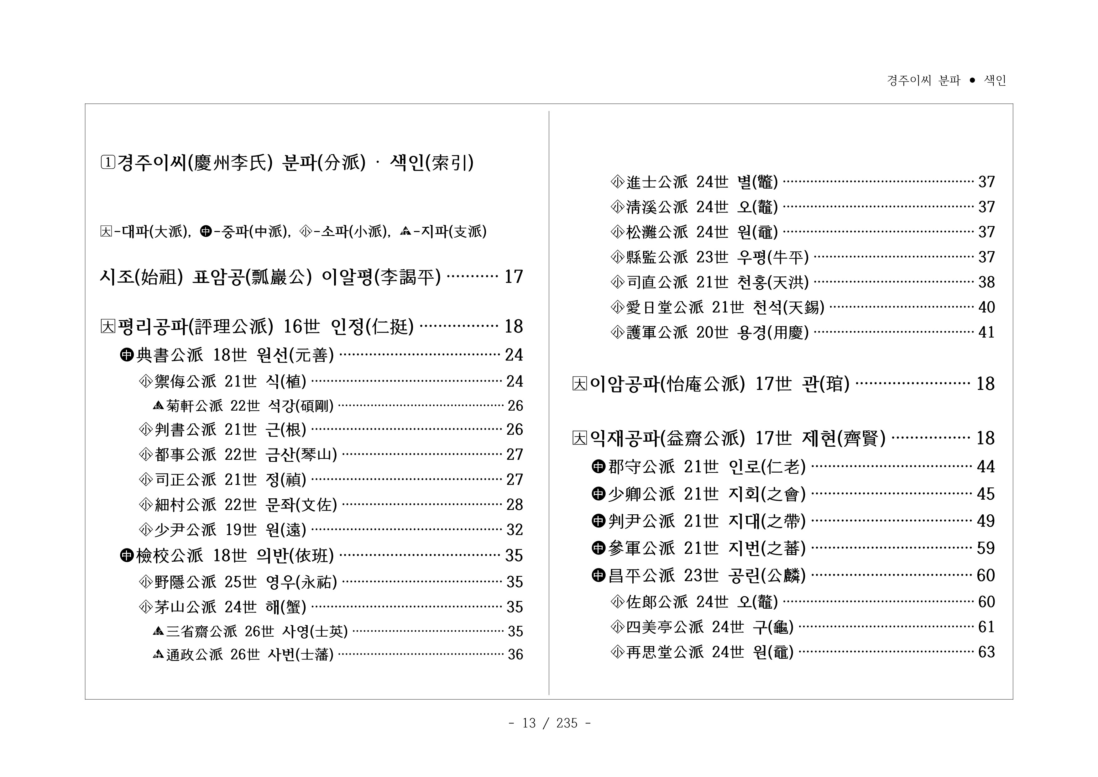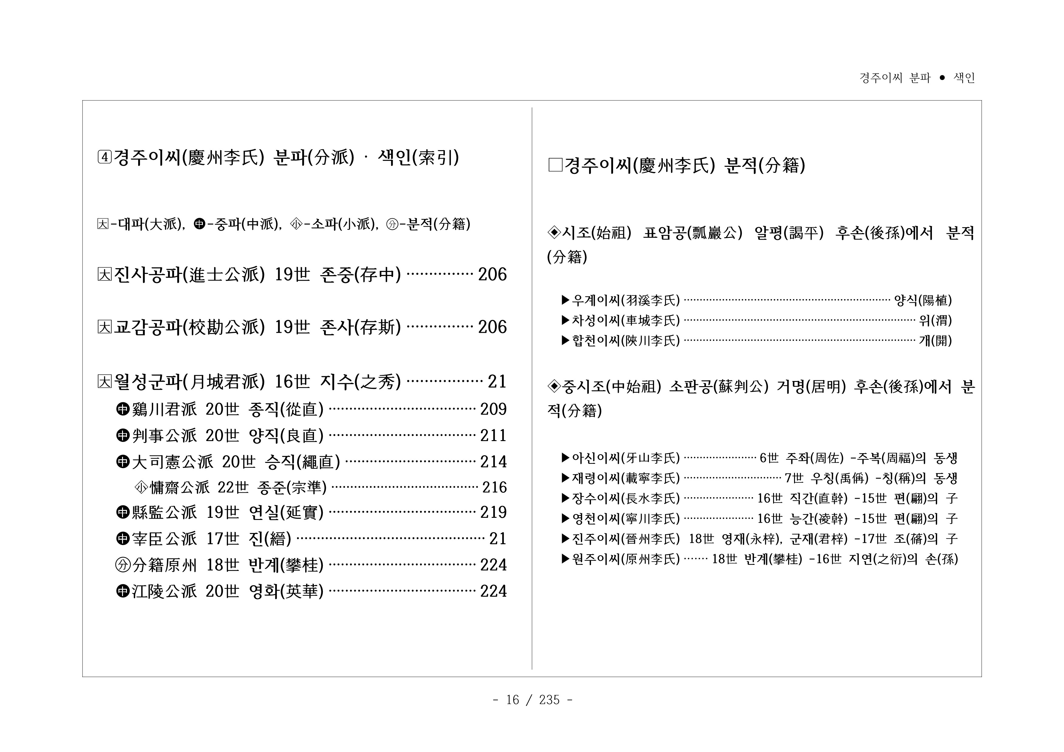 □경주이씨 분파 색인(慶州李氏 分派 索引)