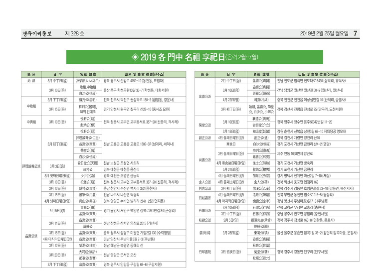 ◈ 各 門中 名祖 享祀日(2019년 2월~7월)